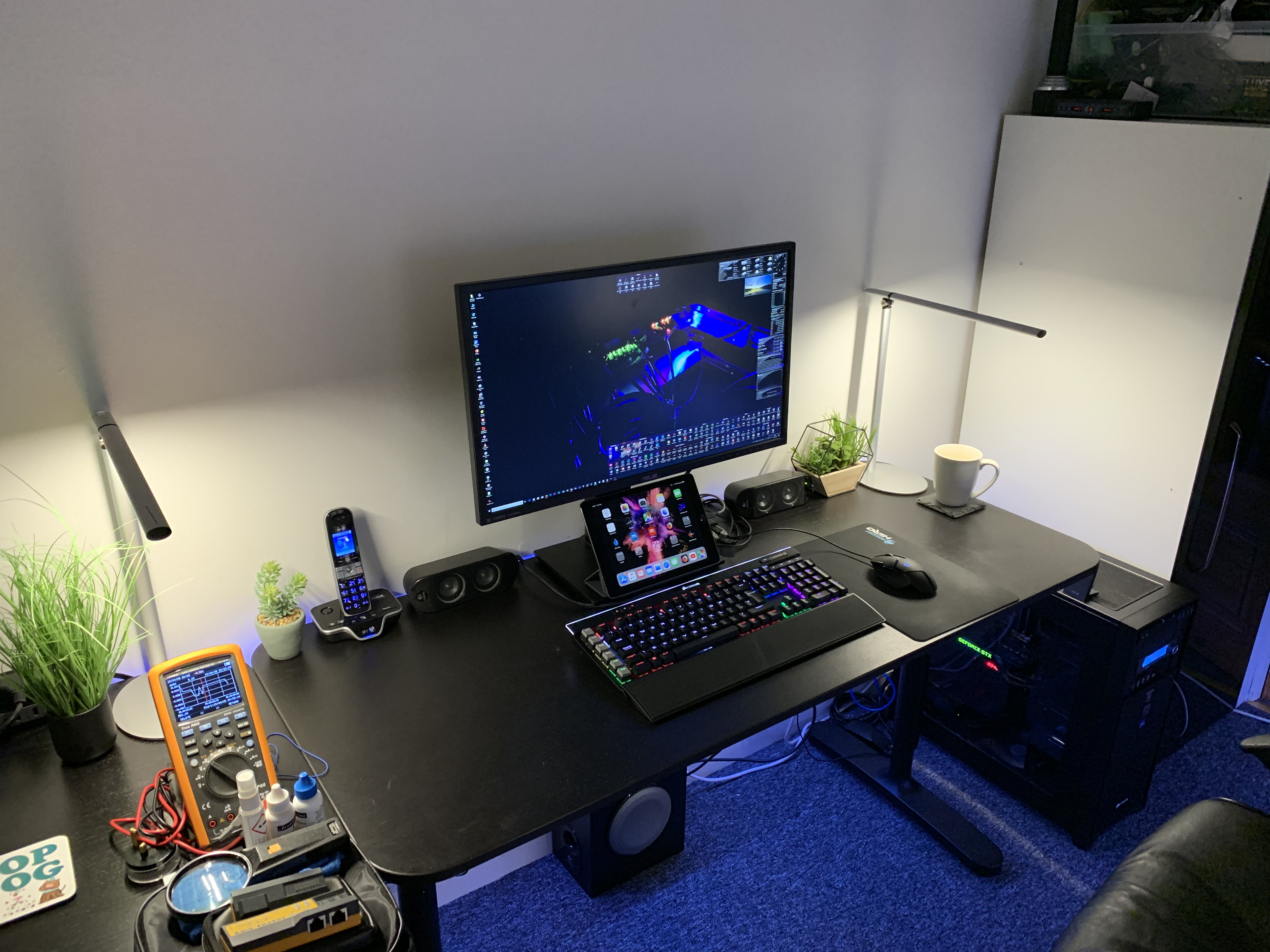 My current main development system was built as a high-end PC for all kinds of tasks, including programming, photo and video editing, gaming, and creative work. The system received an upgrade in 2015 (NVIDIA GeForce GTX 980 Ti), and higher capcity and faster SSDs in 2016 and 2019 (Samsung 850 EVO 960GB and Samsung 850 QVO 960GB respectively). The system originally had three monitors (2x 24" 1920x1200 and 1x 23" 1920x1080). It now has an Asus PB279Q 27" IPS TFT LED backlit LCD which is a 4K monitor running at 3840x2160 resolution. It previously had a Dell UltraSharp UP2715K 27" IPS TFT LED backlit LCD monitor, which runs at 5K resolution (5120x2880), which is undoubtedly the highest quality screen I've personally seen on any system; this is now in use on the Mac Pro instead. There's no going back after using 4K or 5K monitors. The following openBVE add-ons are being developed on it: